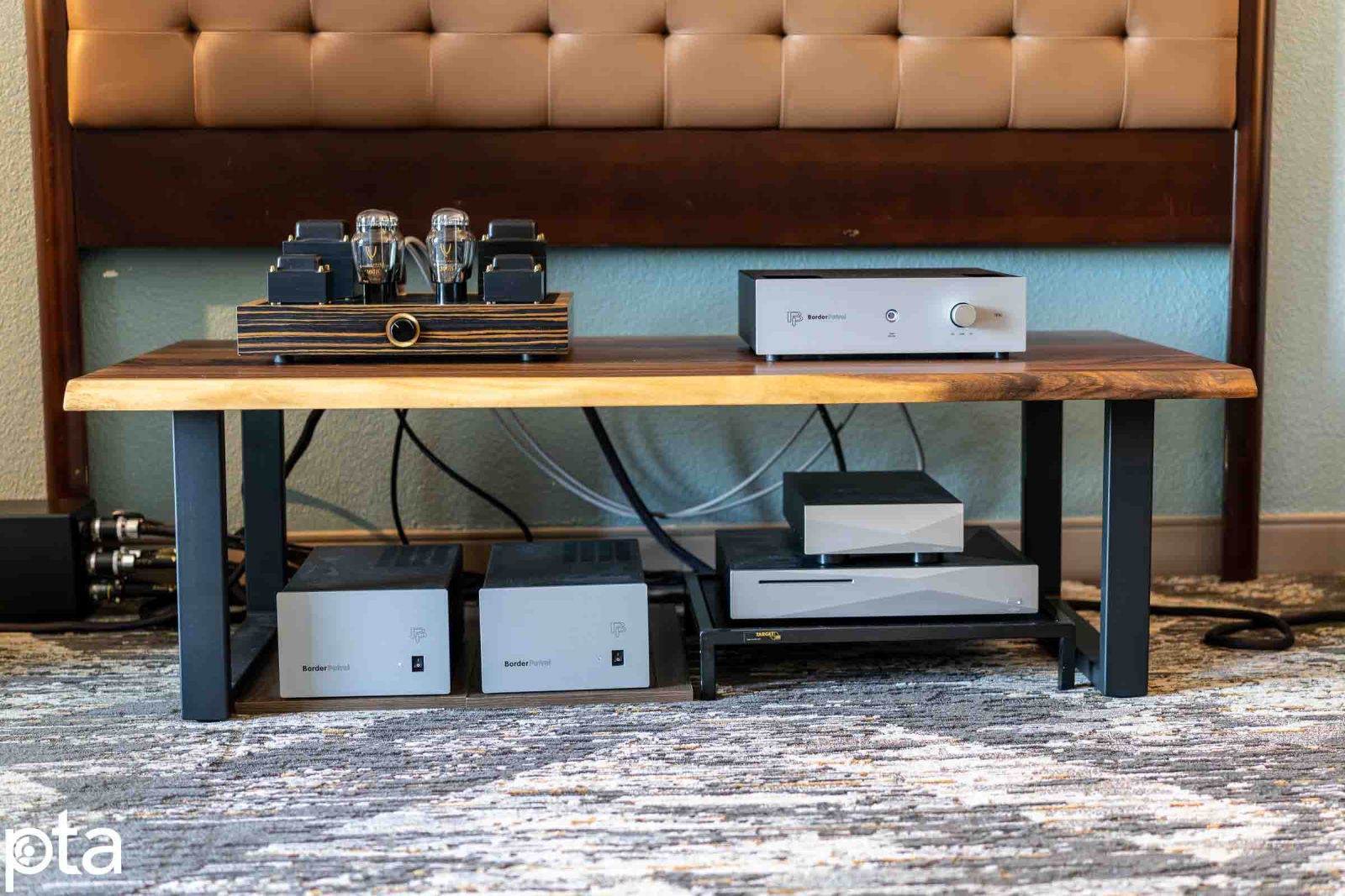 Op de Florida-huis werd de ruimte aangevuld door Triode Pete Grzybowski van Triode Wire Labs. Je herinnert je misschien onze obsessie (gentle nudge) met dit kabelmerk. Hier werden de Obsession NCF-stekerkabels voor voeding getoond (à $1.499 elk, uitgerust met de massieve Furutech-connectoren en gebruikt op de distribute-box), High Power Digital American II ($749 elk — gebruikt op de voedingen), de “regular” Digital American voedingskabel ($549 — gebruikt op de DAC), de American Speaker Cables (vanaf $1.099 per set, hier, bi-wired, met bijpassende jumpers voor de crossover-box), Spirit II interconnects (OCC 7N koper bij $399 per paar) en een Freedom CAT6+-ethernetkabel (vanaf $249 per stuk). De “distributiebox” blijkt eigenlijk een Pi Audio Uberbuss te zijn — en nu opnieuw beschikbaar dankzij de inspanningen van de fijne mensen van GR Research (bekijk dat hier).