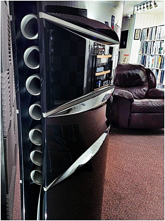 Daarnaast zorgt de opstelling van de woofer, met drie woofers onderaan de voorpagina en de vierde bovenaan, net boven de M-T-M-array, voor een significante verhoging van de trouwe aflevering van dit bandbreedtebereik. Met zo’n uitlijning worden diepe en intense basinformatie zoals de belachelijk dynamische rakettendreiging aan het einde van track 6, “Late Home Tonight, Part I,” van Roger Waters’ meesterwerk Amused to Death [Analogue Productions – AAPP 468761-45], duidelijker weergegeven als de bewegende drukgolven die ze zijn in plaats van alleen maar een samendrukking van de lucht in jouw ruimte. Deze uitlijning laat je bassgolven in de kamer voelen en zien terwijl ze langs je luisterpositie rollen.